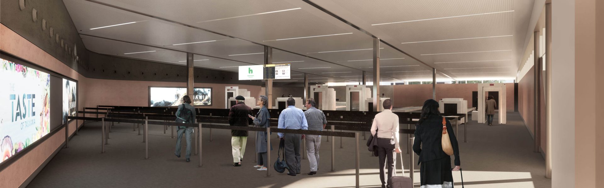 The screening area has been renovated as part of the terminal expansion project increasing to three screening lanes, with additional room for a fourth lane. We’ve created more space for queue management, divestment, and customer recompose areas.